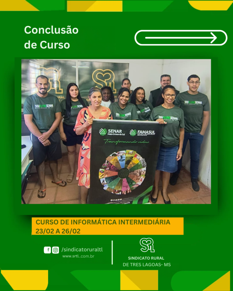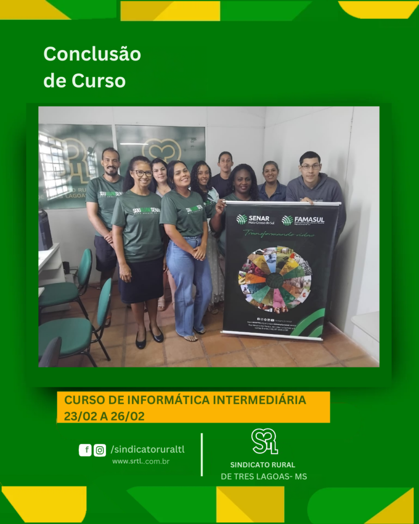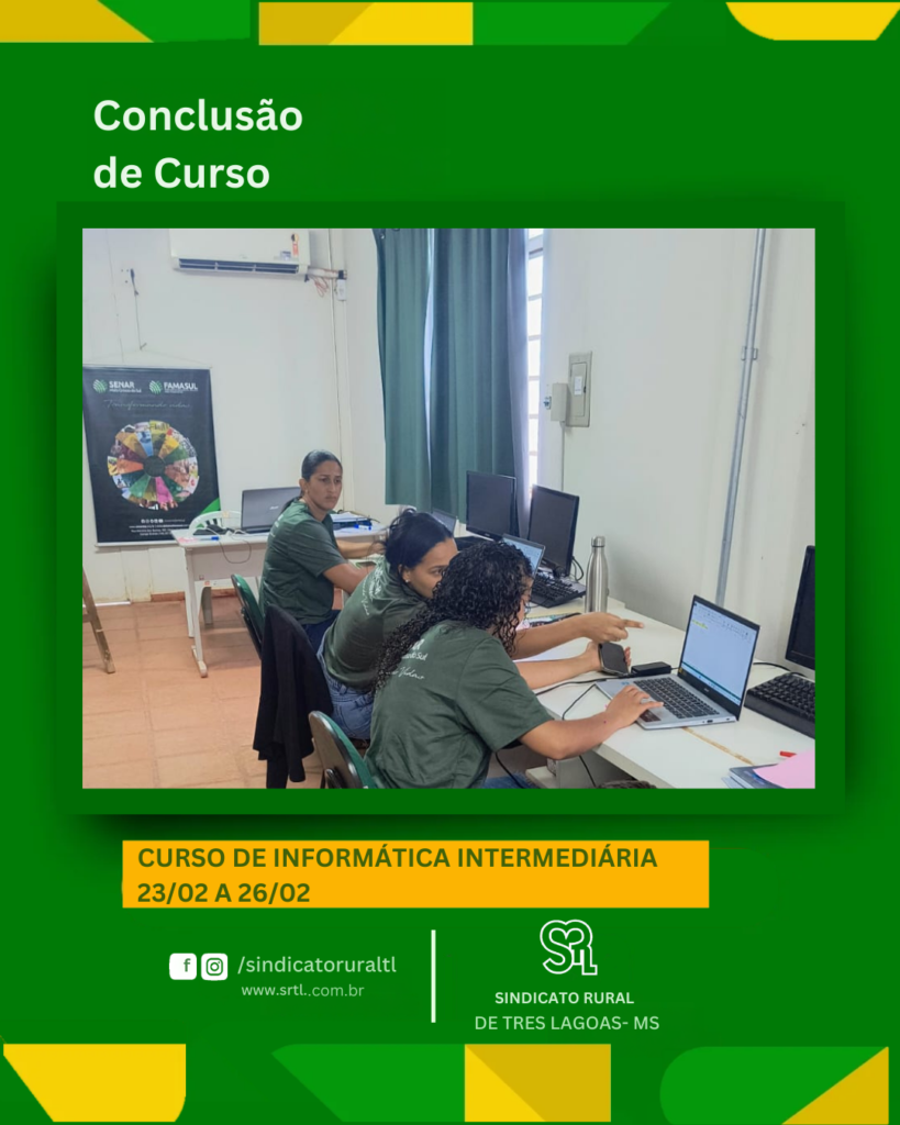 Curso de Informática intermediária, realizado de 23/02 a 26/02, no Sindicato Rural de Três Lagoas, em parceria com o Senar/MS, oferecendo qualificação gratuita e fortalecendo o conhecimento que transforma resultados.