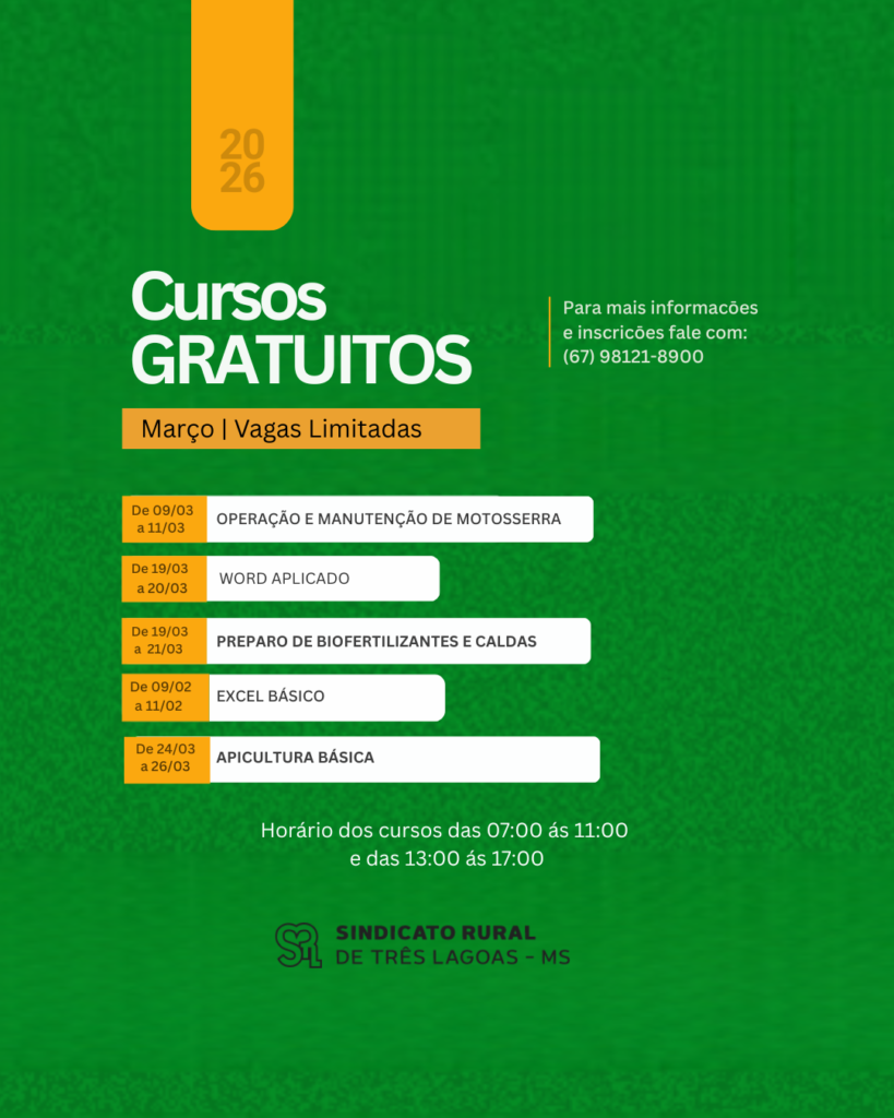 Os cursos gratuitos oferecidos pelo SENAR em parceria com o Sindicato Rural de Três Lagoas já estão com inscrições abertas para o mês de março. A programação inclui formações voltadas ao desenvolvimento profissional no campo, com conteúdos que abrangem práticas produtivas, gestão, sustentabilidade e aprimoramento das atividades rurais.
